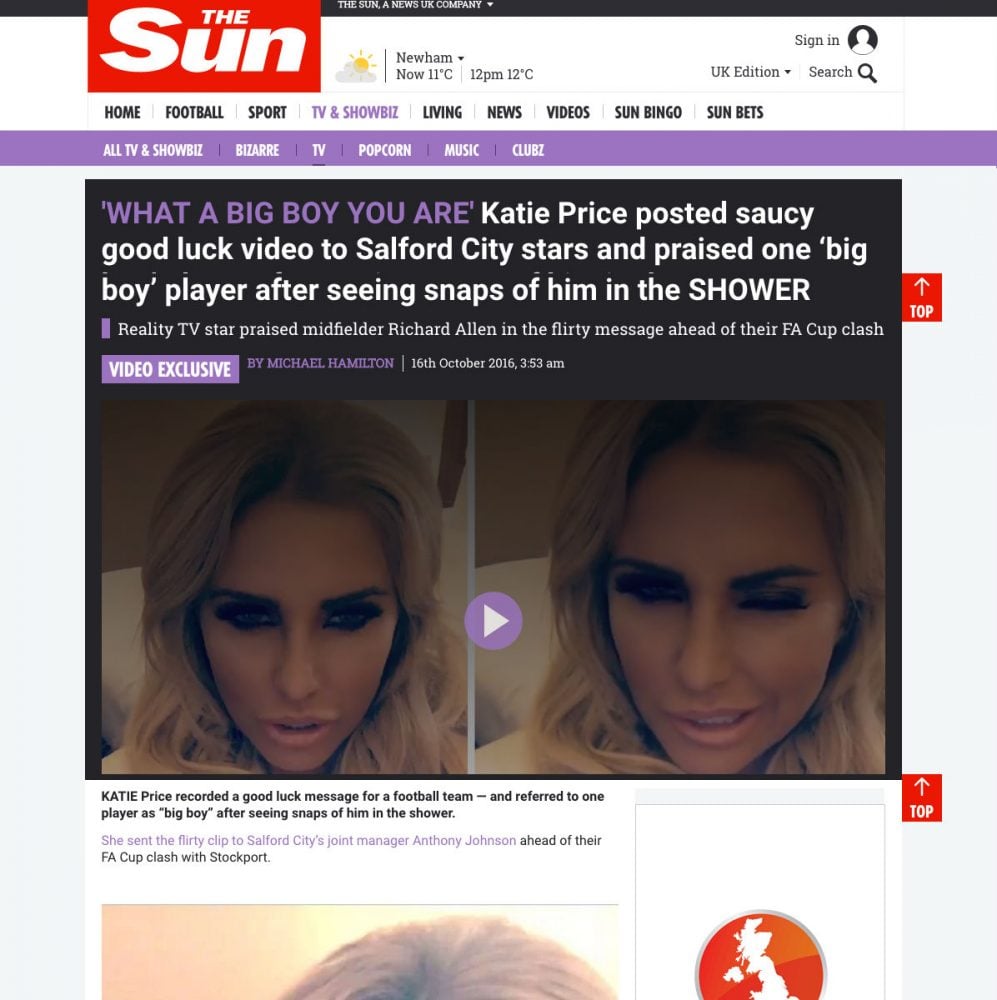 This week we helped a source sell his celebrity video of Kate Price wishing a semi-pro footballer a happy birthday. The appeared in The Sun on Sunday.