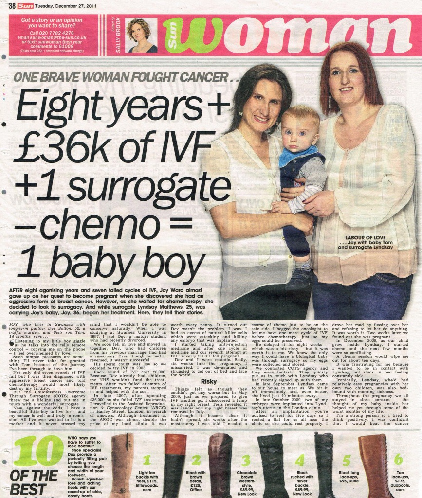 By this point, Joy and her long-term partner, Dev Sutton, 52, knew their only chance of having a baby would be through surrogacy – so in September 2009 they contacted COTS agency and explained their desperate situation.