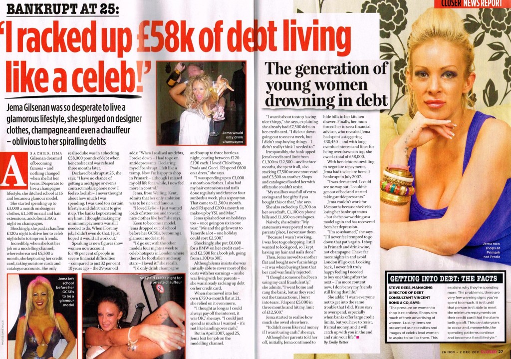 This week TTTP client Jema Gilsenan appears in Closer magazine where she talks about how living a celebrity lifestyle saw her spiral into £58,000 of debt and forced her into bankruptcy at just 25. Jema, now 29, could command £4,000 a month through modelling work but with four store cars, two catalogue accounts and credit […]