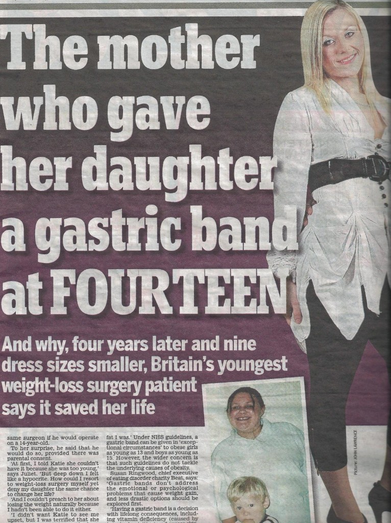 Katie and her mum contacted us at the time and we placed their amazing story in the Sunday Mirror. Back then Katie’s operation was very unusual for a teenager, but recent research revealed that the number of teenagers having weight loss surgery has quadrupled in the last three years.